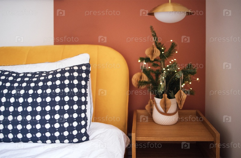 Уютная сцена спальни с желтой мягкой кроватью с узорочной подушкой, деревянным ночным столом и небольшой декоративной рождественской елкой со свечами и украшениями, создавая теплую атмосферу