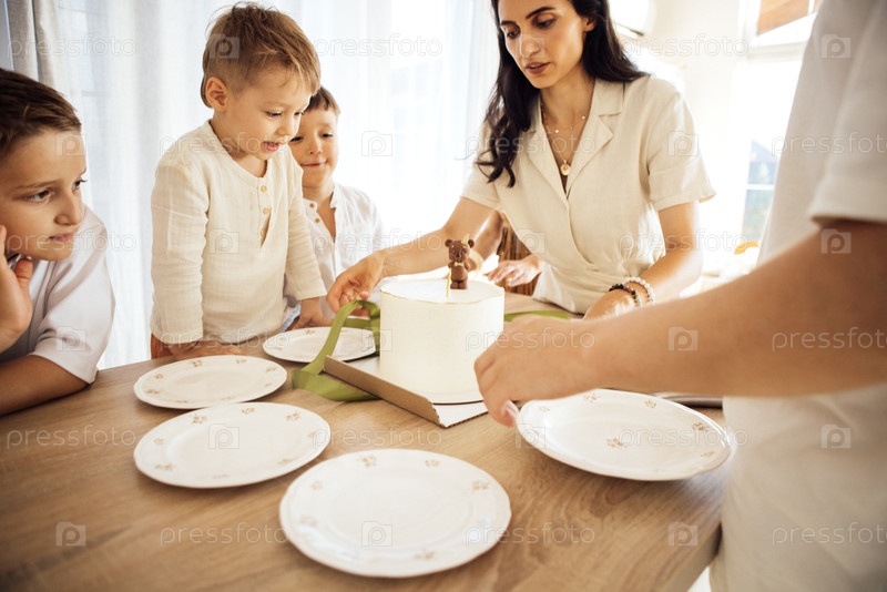 Женщина с длинными темными волосами готовит торт на день рождения, а дети с нетерпением смотрят, окруженные тарелками на деревянном столе, создавая радостную атмосферу праздника