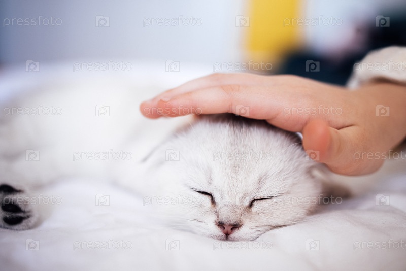 Белый кот тихо отдыхает на мягкой кровати, в то время как нежная рука гладит его голову, захватывая спокойный момент общения и привязанности в уютной среде