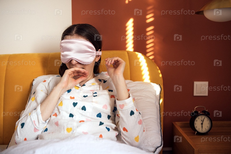 Молодая женщина в симпатичной пижаме и снотворной маске сидит на своей кровати, улыбаясь