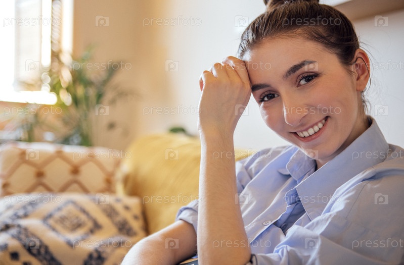 Портрет симпатичной девушки в синей рубашке на диване в гостиной