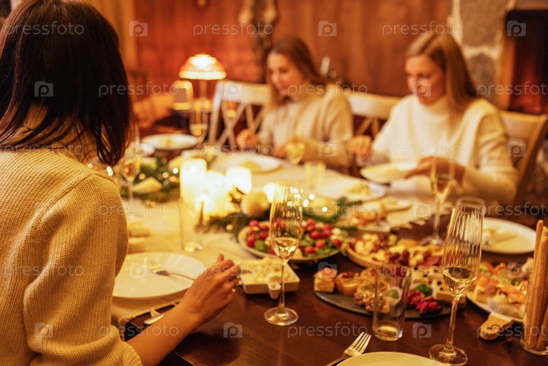 Праздничный стол, вкусные блюда и бокалы для шампанского