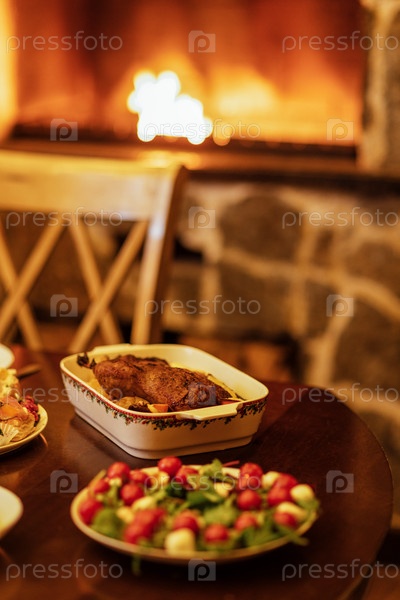 Закрытие традиционной выпеченной утки для рождественской вечеринки.Вкусные блюда на праздничном столе.Встреча друзей и семьи за камином дома