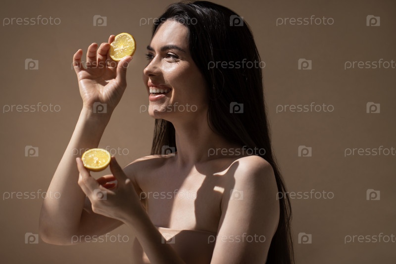 Молодая женщина с длинными темными волосами держит свежие лимонные половинки, радостно улыбается, освещается мягким естественным светом на теплом нейтральном фоне, показывая свежесть и жизненную силу