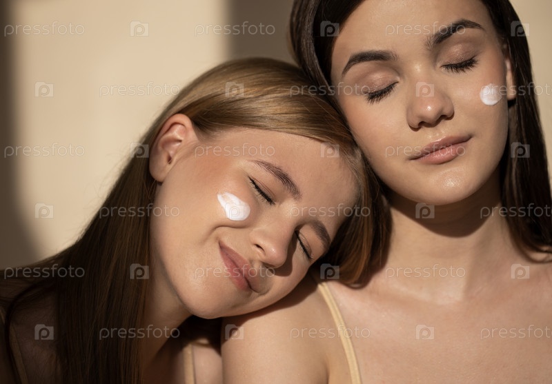 Две молодые женщины с кремом для ухода за кожей на лицах наслаждаются моментом расслабления, демонстрируя дружбу и красоту в теплой мягкой обстановке с нежными выражениями