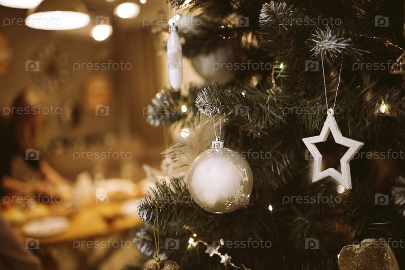 Рождественская елка, украшенная праздничными декорациями, включая звезду и стеклянный пузырь, создает теплую праздничную атмосферу в уютной обстановке в мягко освещенной комнате