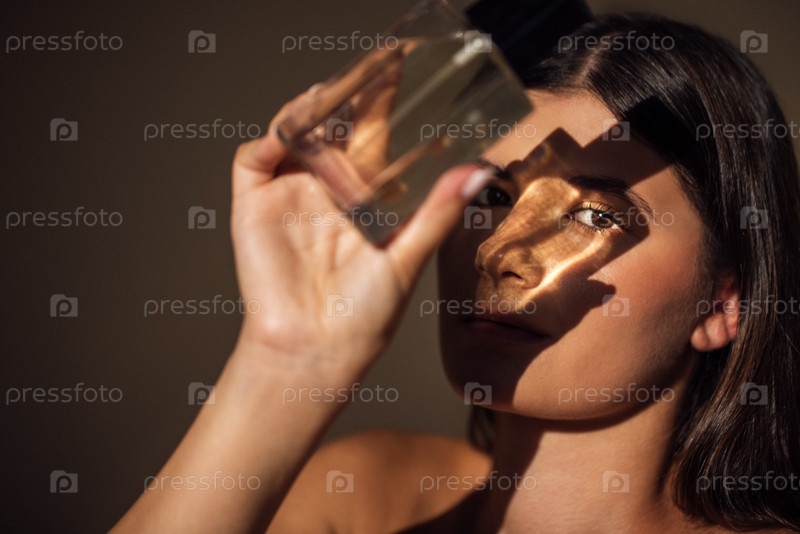Молодая женщина, держащая бутылку парфюма, бросает драматическую тень на ее лицо, демонстрируя красоту и элегантность в мягкой освещенной атмосфере с теплыми тонами и текстурами