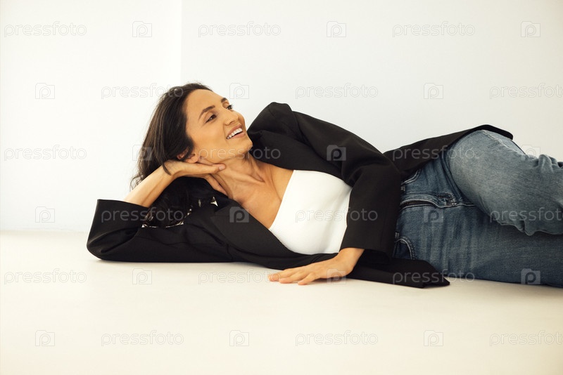 Улыбающаяся женщина с длинными темными волосами, одетая в стильный черный блейзер и простые джинсы, лежащая на светлой поверхности, излучая уверенность и расслабленную элегантность в современной обстановке