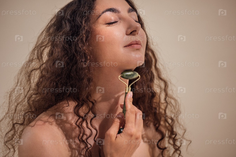 Женщина с кудрявыми волосами, использующая нефритовый ролик на лице во время процедуры по уходу за кожей, с мягким нейтральным фоном, способствующим релаксации и самообслуживанию