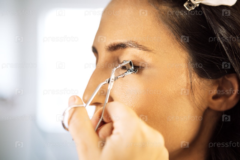 Женщина с темными волосами выкручивает ресницы металлическим цилиарным крейлером в ярком салоне красоты, демонстрируя профессиональный процесс нанесения макияжа
