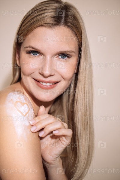 Женщина с длинными светлыми волосами наносит увлажняющий крем на плечо, демонстрируя форму сердца, нарисованного в лосьоне, подчеркивая уход за кожей и самообслуживание с помощью копирования пространства
