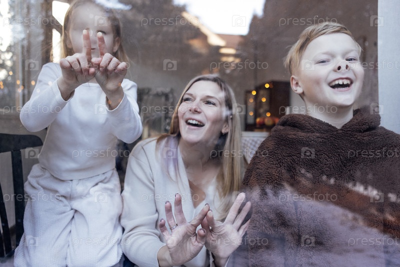Семья проводит время в помещении, улыбается и играет руками к окну, создавая радостную атмосферу в зимний сезон с уютной домашней средой