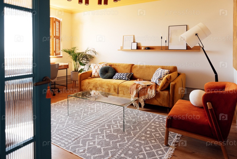 Уютная гостиная со стильным оранжевым креслом, современным желтым диваном, украшенным подушками и стеклянным столом для кофе на рисунковом ковре, создает теплую и привлекательную атмосферу