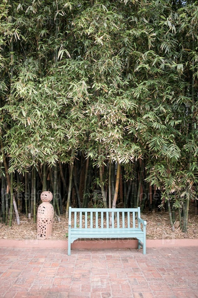 Спокойная сцена на открытом воздухе с голубой деревянной скамейкой перед пышными зелеными бамбуковыми листьями, дополненной декоративной каменной фигурой, создающей спокойную атмосферу для отдыха