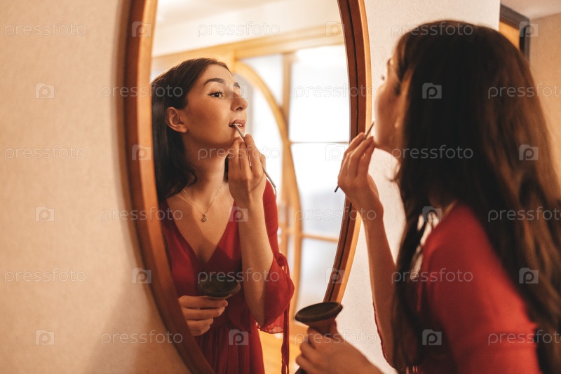Молодая женщина наносит помаду перед зеркалом, одета в красное платье, демонстрируя рутину красоты и самообслуживания в уютной обстановке в тепло освещенной комнате