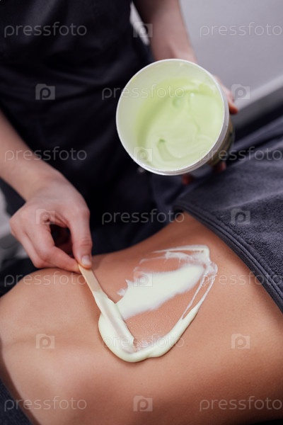 Женская спа-терапевт наносит успокаивающий зеленый крем на спину клиента с помощью деревянной лопаты, демонстрируя методы релаксации и ухода за кожей в спокойной среде оздоровления