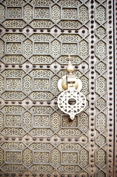 Декоративная металлическая дверь со сложными геометрическими узорами и декоративным стукачом, демонстрирующая мастерство и культурную доблесть в архитектурном дизайне