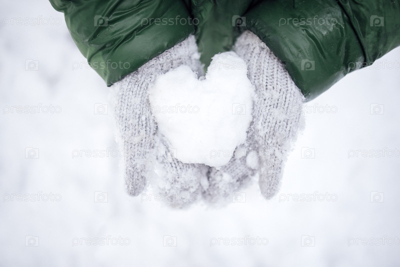 Руки в серых перчатках держат снежный шар в форме сердца, окруженный заснеженным пейзажем, демонстрируя зимнюю радость и тепло в холодной среде с чувством любви и единства