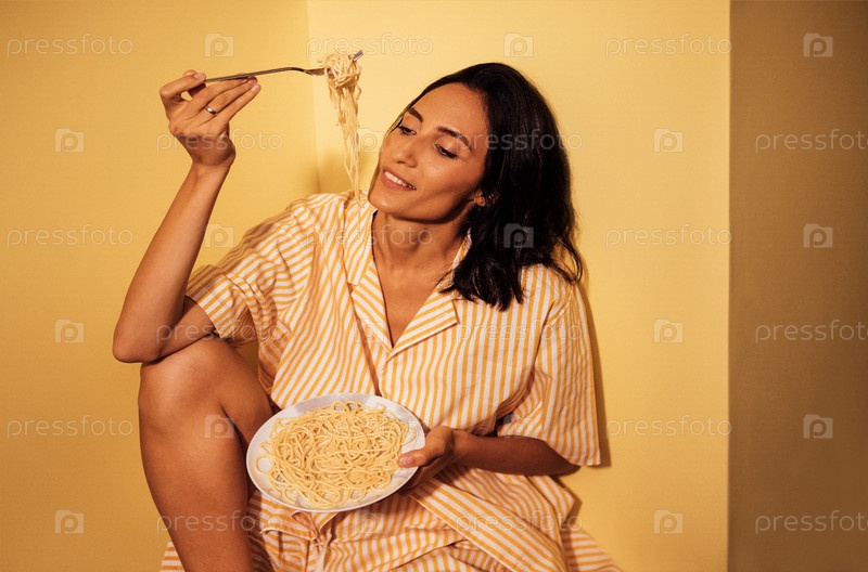 Женщина наслаждается тарелкой спагетти, сидит на ярко-желтой стене в полосатой пижаме и показывает уютный и расслабленный обед дома
