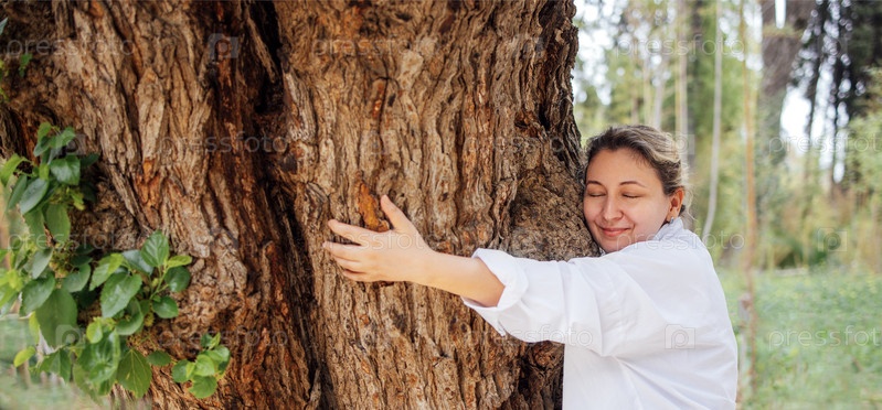 Женщина с светло-коричневыми волосами обнимает большое дерево в спокойной окружающей среде, демонстрируя связь с природой и поощряя экологическую осведомленность и любовь к деревьям
