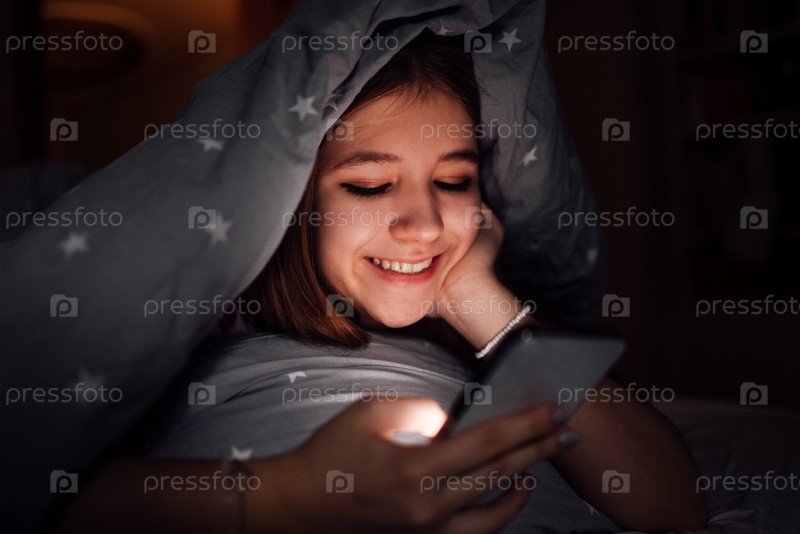 Молодая девушка с блондинками, улыбающаяся при использовании смартфона под уютным одеялом, освещается светом экрана, создавая теплую и приглашающую ночную атмосферу для отдыха
