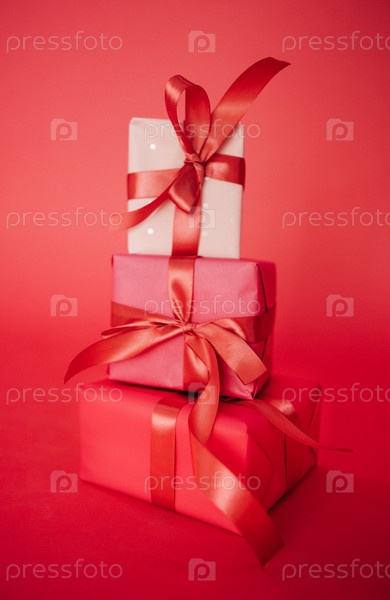 Три подарка в яркой упаковке с атласовыми луками на розовом фоне