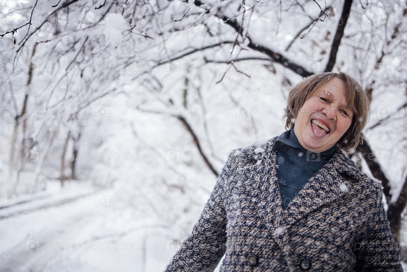 Веселая женщина с короткими волосами, одетая в стильное зимнее пальто, игриво вытягивающая язык в снежном пейзаже, окруженная замерзшими деревьями - захватывающий момент зимнего веселья