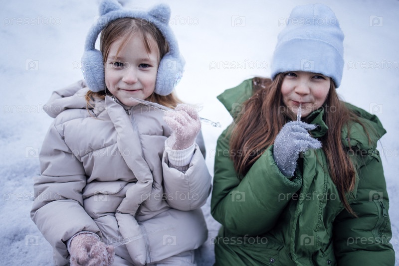 Две молодые девочки наслаждаются зимними развлечениями, носят уютные куртки и наушники, сидят на снегу, держат леденцы, захватывая радость снегового дня в игривой атмосфере