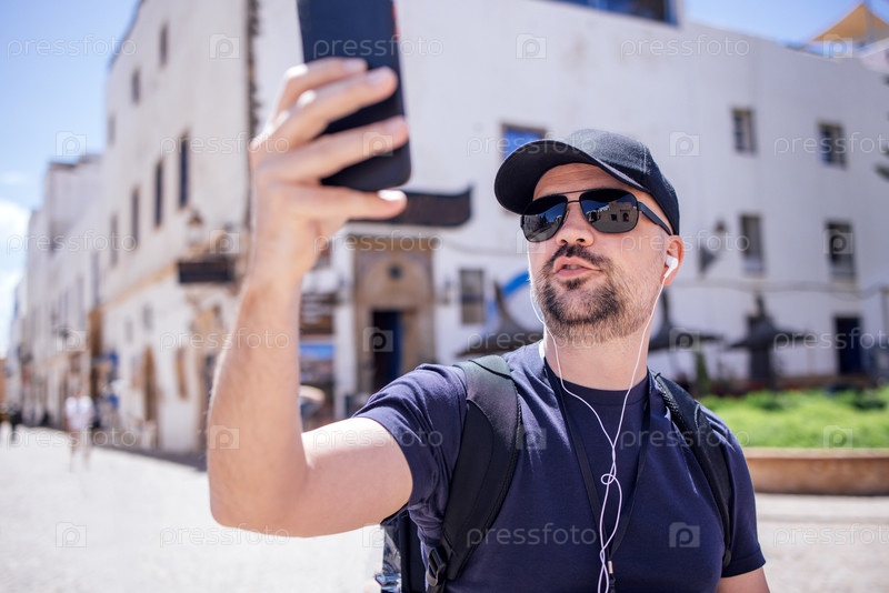 Мужчина с бородой и солнцезащитными очками делает селфи со своим смартфоном, нося наушники, наслаждаясь солнечным днем в городской среде с зданиями на заднем плане