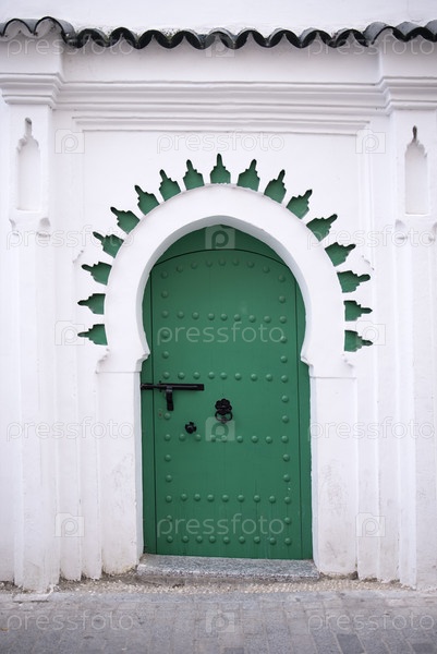 Зеленая дверь со сложной конструкцией арки и декоративными элементами, установленной на белой стене, показывает традиционный архитектурный стиль и культурное наследие