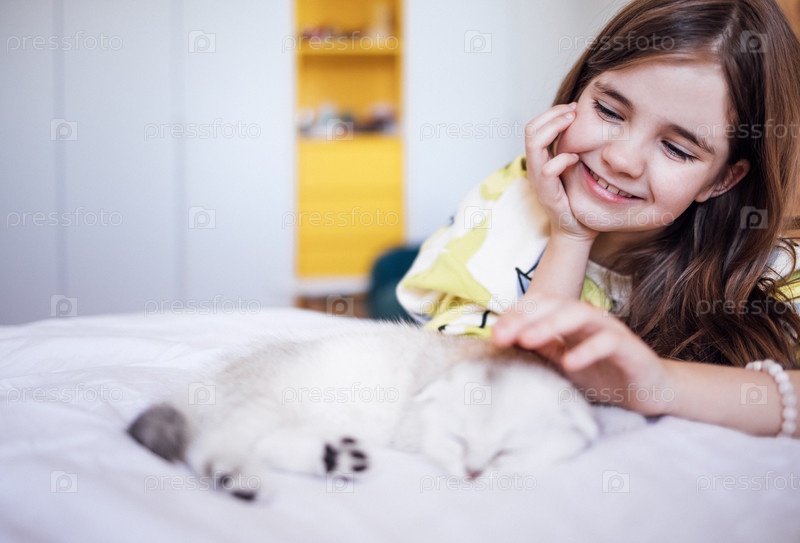 Молодая девушка с длинными волосами улыбается, нежно поглаживает спящего котенка на уютной кровати, окружена ярким, веселым декором, захватывая момент радости и общения