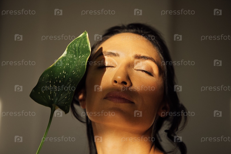 Женщина с закрытыми глазами нежно держит зеленый лист на лице, освещенный мягким солнечным светом, создавая спокойную атмосферу спокойствия и связи с природой