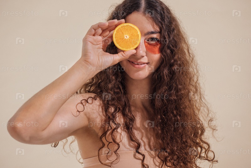 Молодая женщина с кудрявыми волосами игриво держит перед глазами фрагмент апельсина, демонстрирующий яркие цвета и веселую атмосферу, идеально подходящую для летних визуальных эффектов