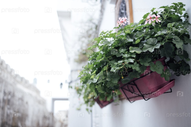 Ярко-зеленые растения в розовых горшках висят на белой стене, добавляя природу к городской среде и увеличивая эстетическую привлекательность аллеи