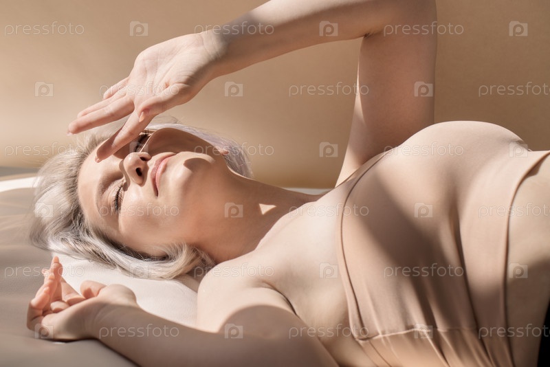 Женщина с короткими серебристыми волосами лежит на мягкой поверхности, греется в естественном свете, со спокойным выражением лица, демонстрируя расслабление и спокойствие в минималистической обстановке