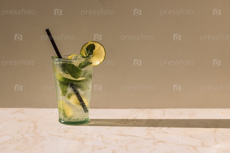 Завершаю стакан вкусного мохито с лаймом и свежей мятой.Вкусный лимонад с кубиками льда на мраморном столе