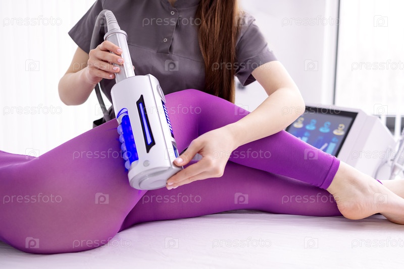 Женщина-эстетик использует передовое устройство контурирования тела на ногах клиентов, демонстрируя современные косметические процедуры в яркой и спокойной спа среде с высокотехнологичным оборудованием