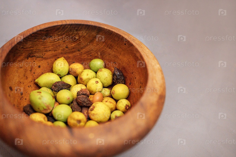 Деревянная миска, наполненная разнообразными свежими арганскими орехами, показывающая яркие цвета и текстуры, размещенные на нейтральном фоне, подчеркивая естественную красоту и органические элементы