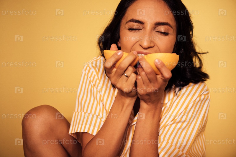 Улыбающаяся женщина с темными волосами в полосатой пижаме, держащая свежий фрукт в обеих руках, наслаждаясь радостным моментом на ярко-желтом фоне, захватывая счастье и благополучие
