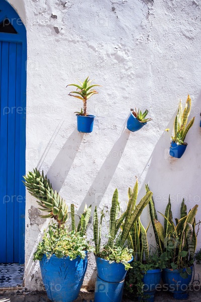 Ярко-синие горшки с пышными зелеными растениями расположены на текстурированной белой стене, демонстрируя красивый контраст цветов и естественную красоту в спокойной окружающей среде