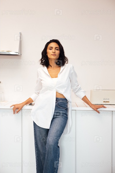 Уверенная женщина с темными волосами в белой рубашке и синих джинсах опирается на стойку в современном рабочем пространстве, демонстрируя расслабленную, но профессиональную атмосферу