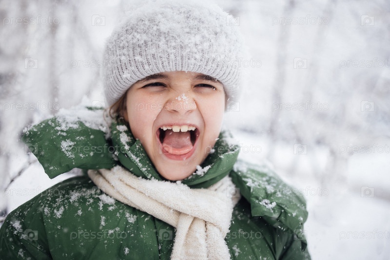Молодая девушка с радостным выражением лица, одетая в зеленое зимнее пальто и вязанную шляпу, окруженная заснеженными деревьями, обнимающая красоту зимы и игривого духа