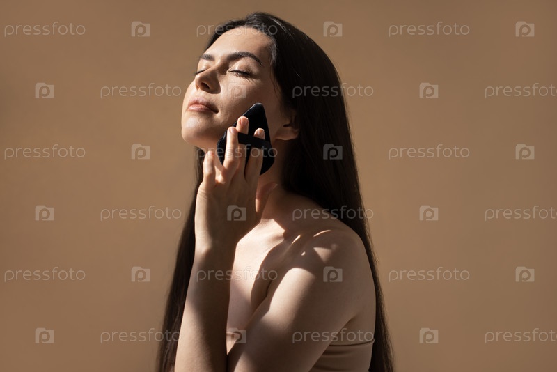Азиатская женщина с длинными волосами, аккуратно использующая макияж лица, освещенный мягким естественным светом, создает спокойную и успокаивающую атмосферу красоты