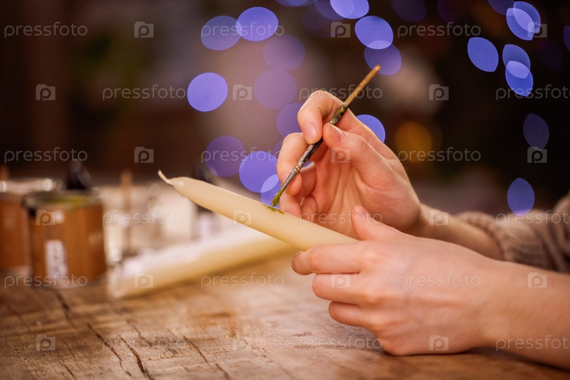 Руки творческого человека рисуют свечу ярких цветов, окруженную предметами искусства и мягкими огнями боке, демонстрируя художественный процесс и мастерство