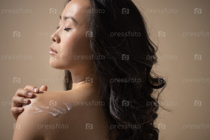 Азиатская женщина с длинными гладкими волосами, наносит крем на плечо, демонстрирует рутину ухода за кожей, мягкое освещение, улучшает естественную красоту и спокойствие в спокойной обстановке