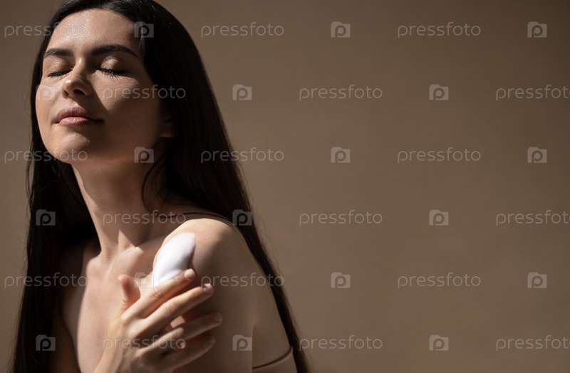 Молодая женщина с длинными темными волосами наносит продукт по уходу за кожей на свое плечо, наслаждаясь моментом самообслуживания в мягкой, нейтральной тонированной среде с теплым освещением