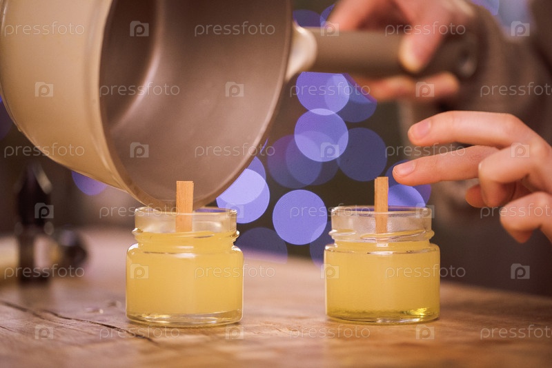Человек наливает расплавленный воск в маленькие стеклянные банки с деревянными фитилями, создавая самодельные свечи, окруженные мягким боке, демонстрируя уютную атмосферу ремесла