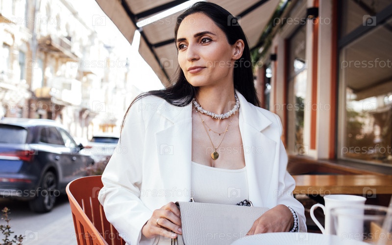 Элегантная женщина с длинными темными волосами, в белом блейзере, сидящая за столом кафе, наслаждаясь напитком, с городской уличной сценой и припаркованными автомобилями на заднем плане, демонстрируя современный образ жизни