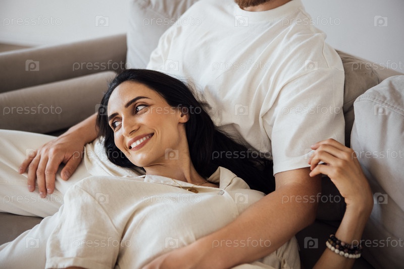 Пара отдыхает вместе на уютном диване, делясь интимными моментами с мягким освещением, создавая теплую атмосферу, демонстрируя любовь и связь в современном жилом пространстве