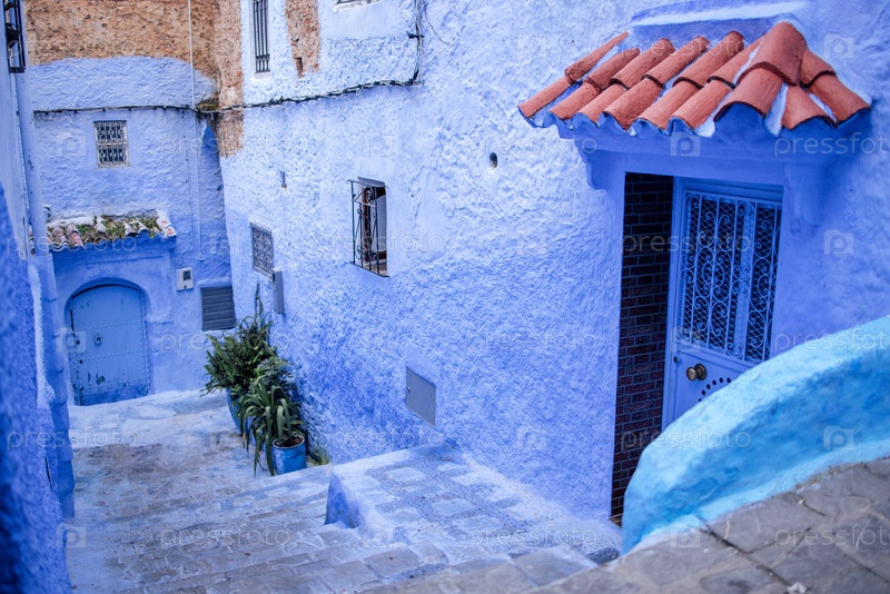 Очаровательный синий переулок с традиционной архитектурой, с ярко-синими стенами, терракотовыми плитками и пышной зеленью, создавая живописную сцену спокойствия и культуры